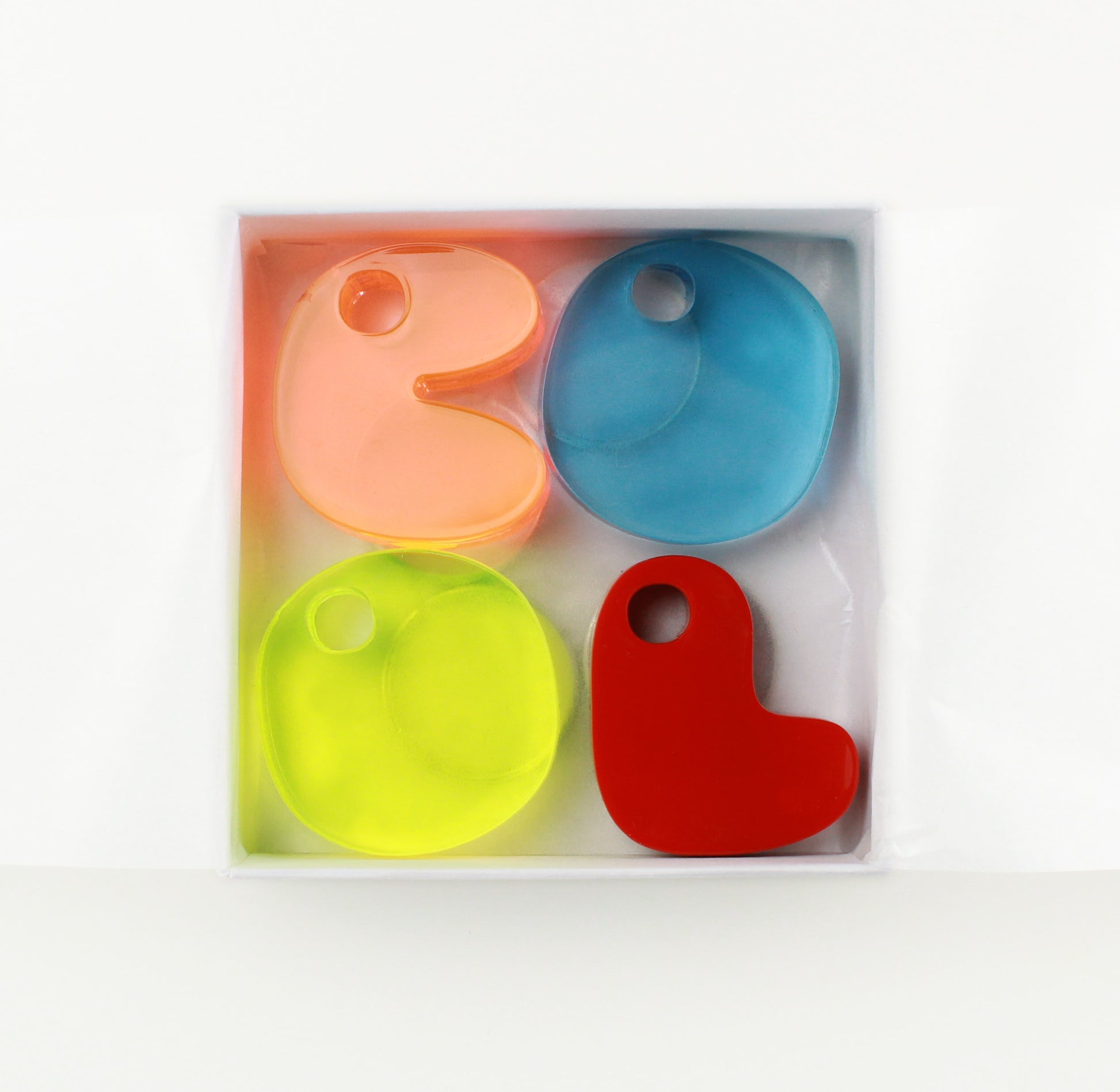 Laser cut from 6 to 10 mm transparent or solid acrylic. The colour combinations are collated by studio mo man tai; depending on the leftover colours their supplier collected – let them surprise you.