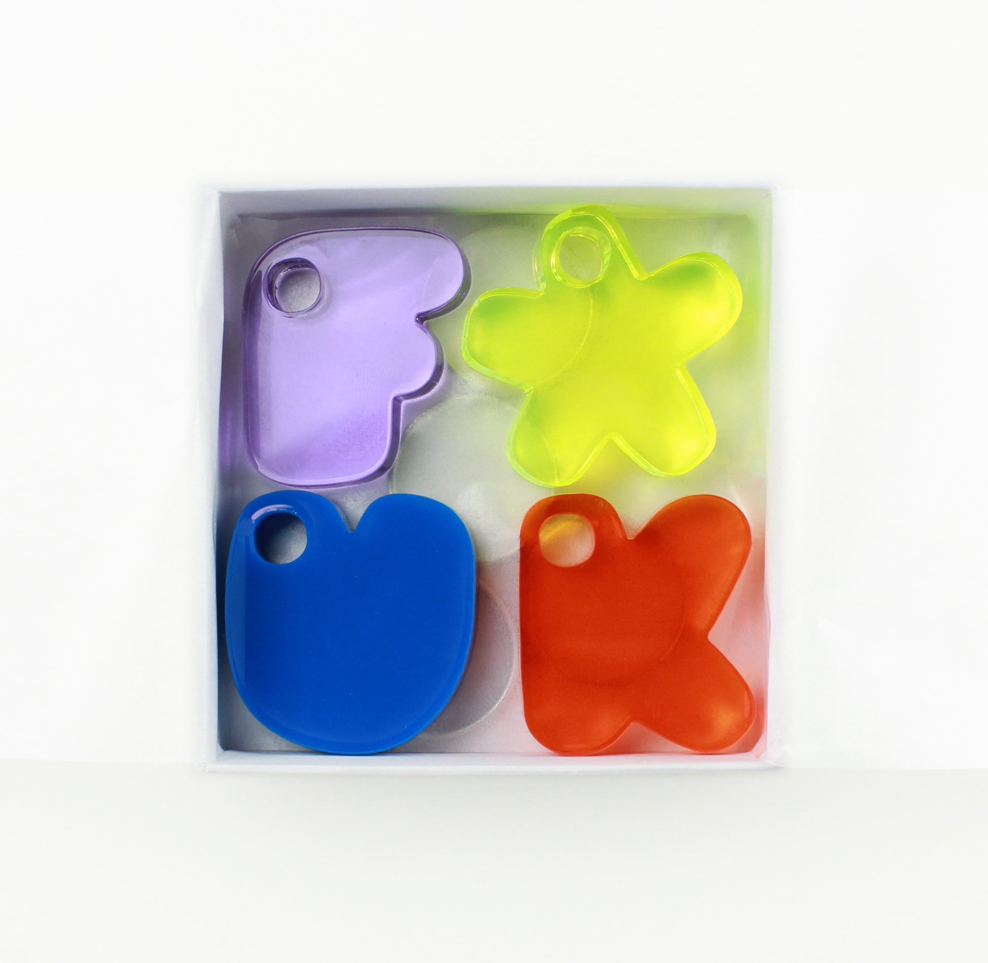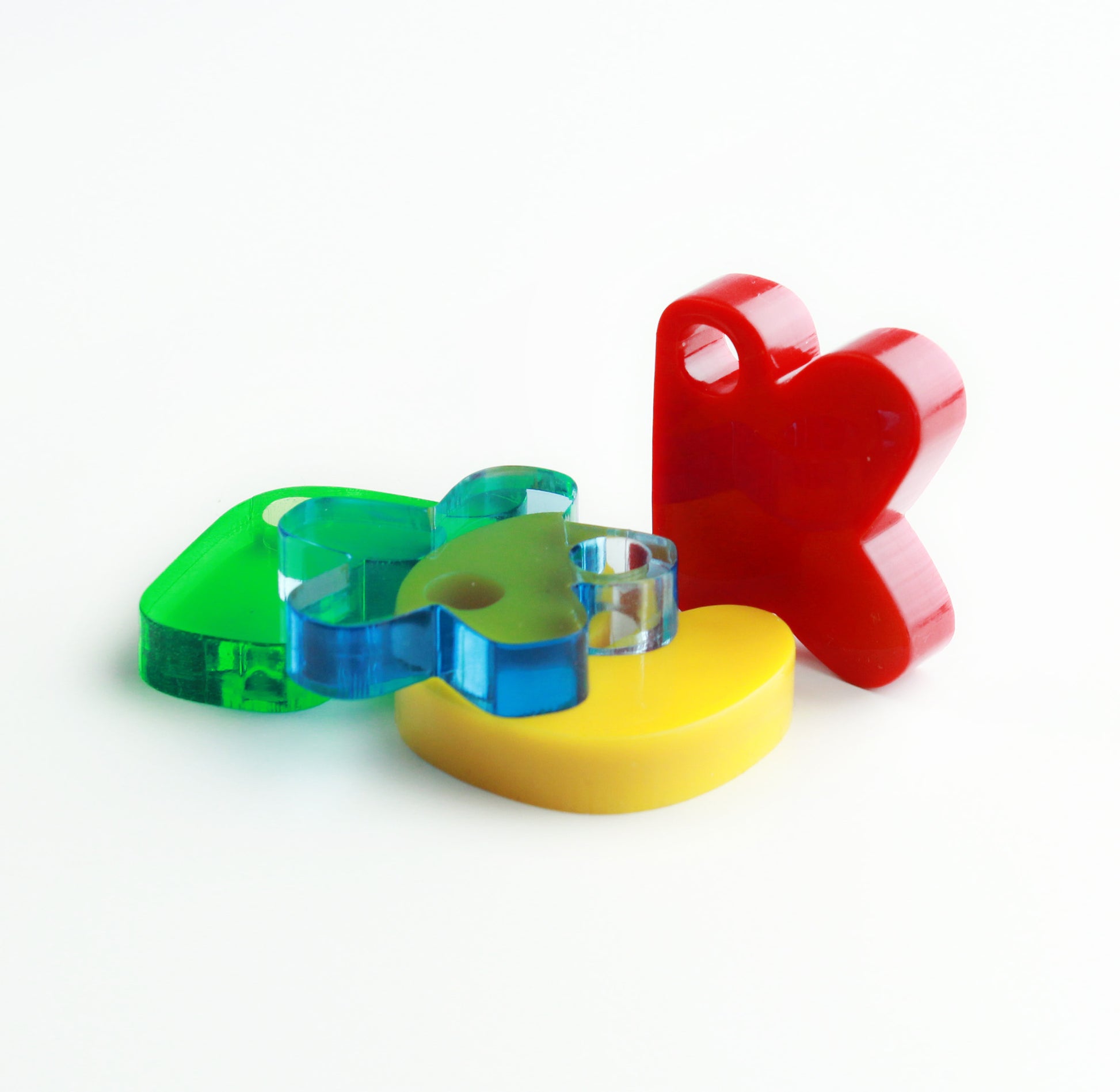 Laser cut from 6 to 10 mm transparent or solid acrylic. The colour combinations are collated by studio mo man tai; depending on the leftover colours their supplier collected – let them surprise you.