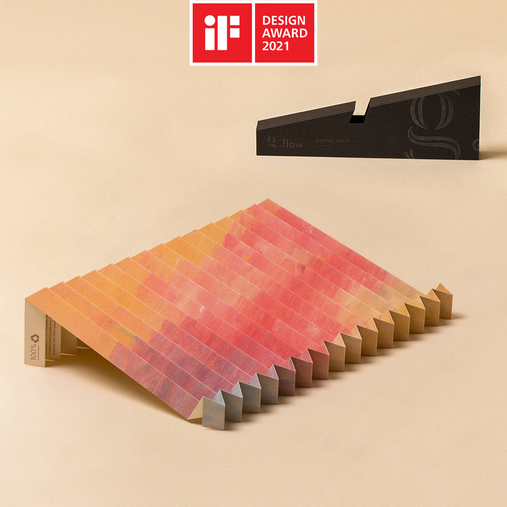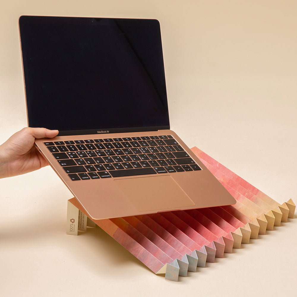 The product is completely free from chemical processes such as adhesives and coatings and is designed to return to nature at the end of its life. Origamic structure allows a single sheet of recycled paper to become a product without any chemical processing. This attractive folding technology allows you to withstand 5kg of heavy laptops, and helps to keep the air flowing preventing the devices from overheating.