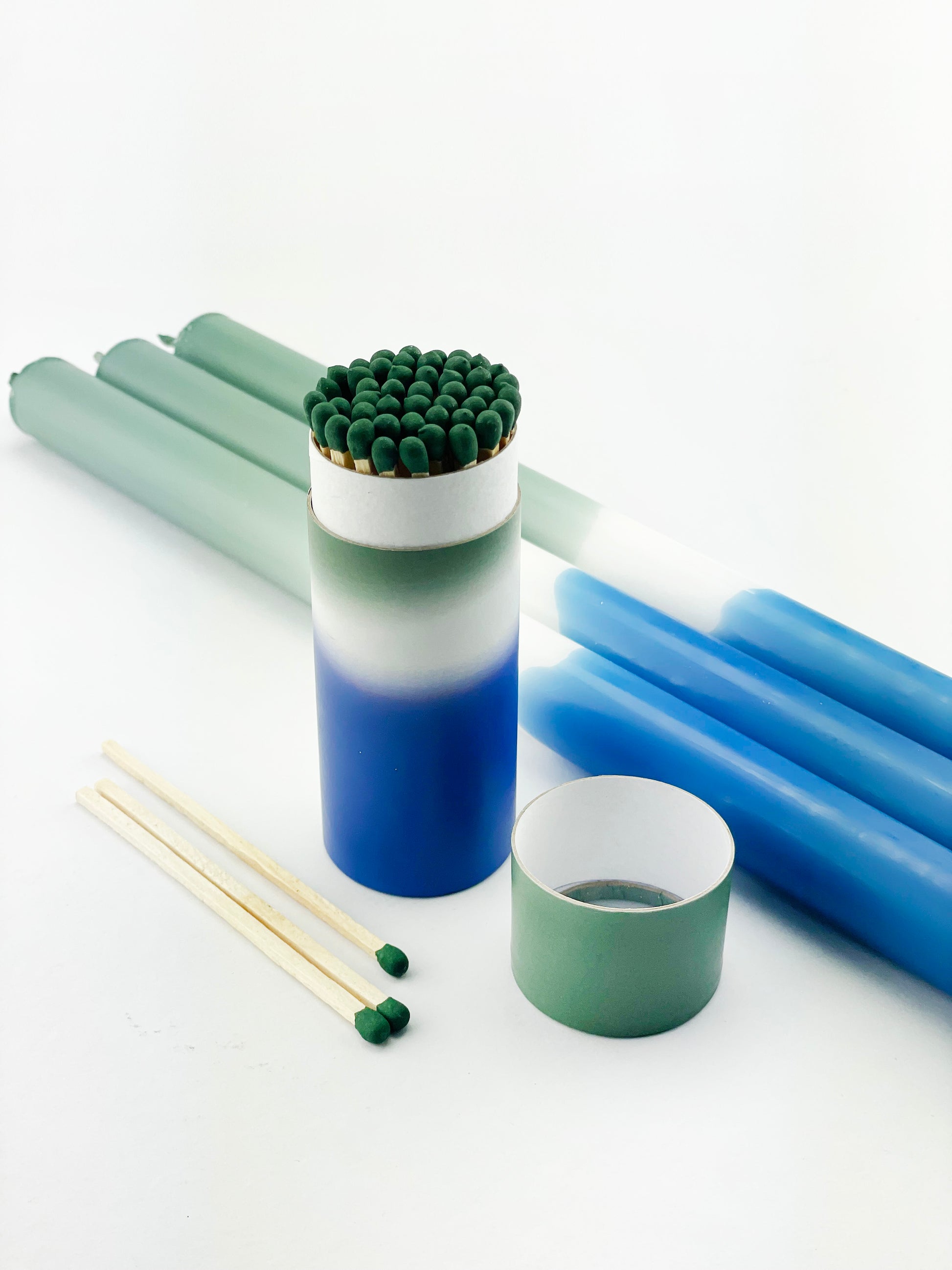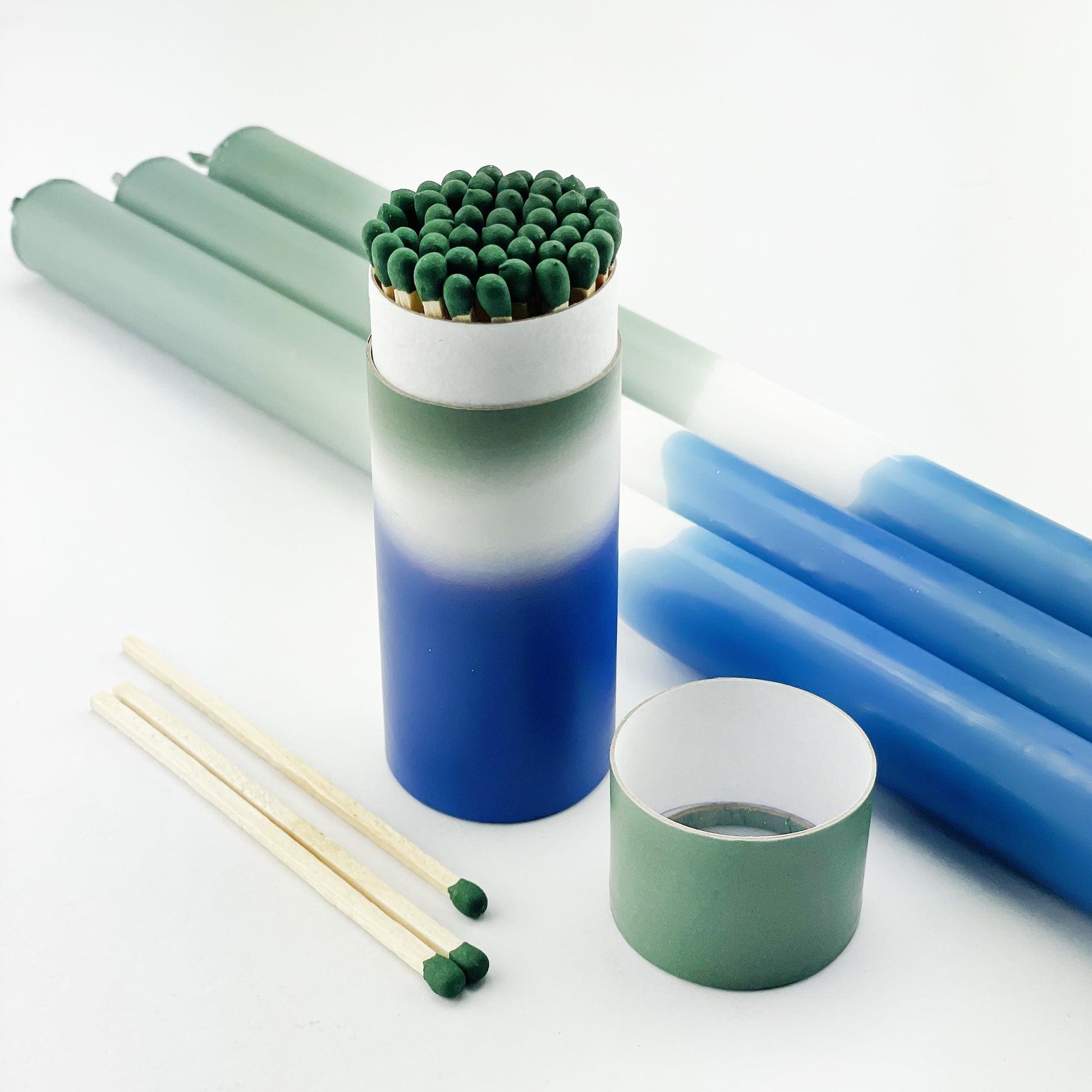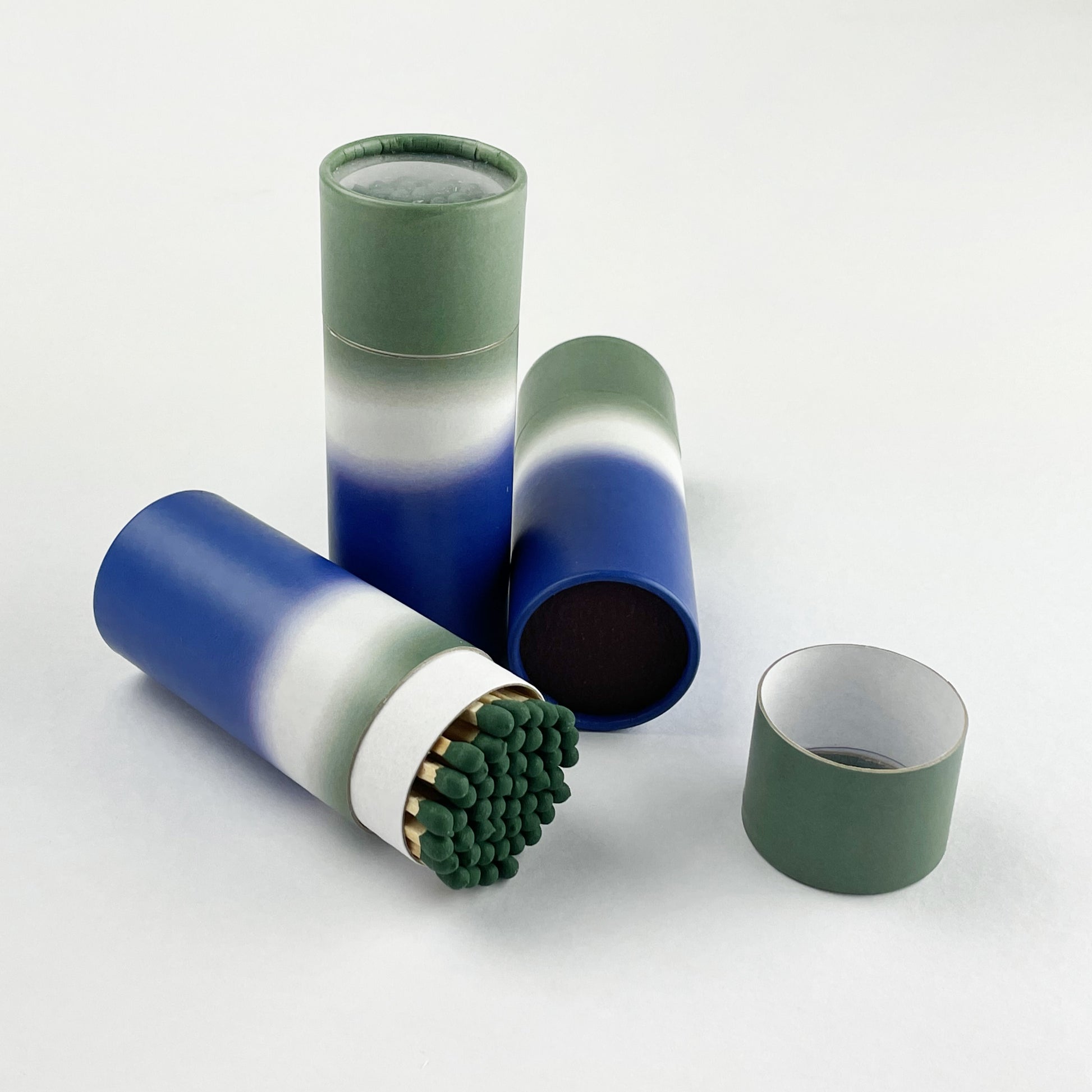 These new ‘colour coordinated’, cylindrical match boxes contain aproximately 55 extra long and robust matches.