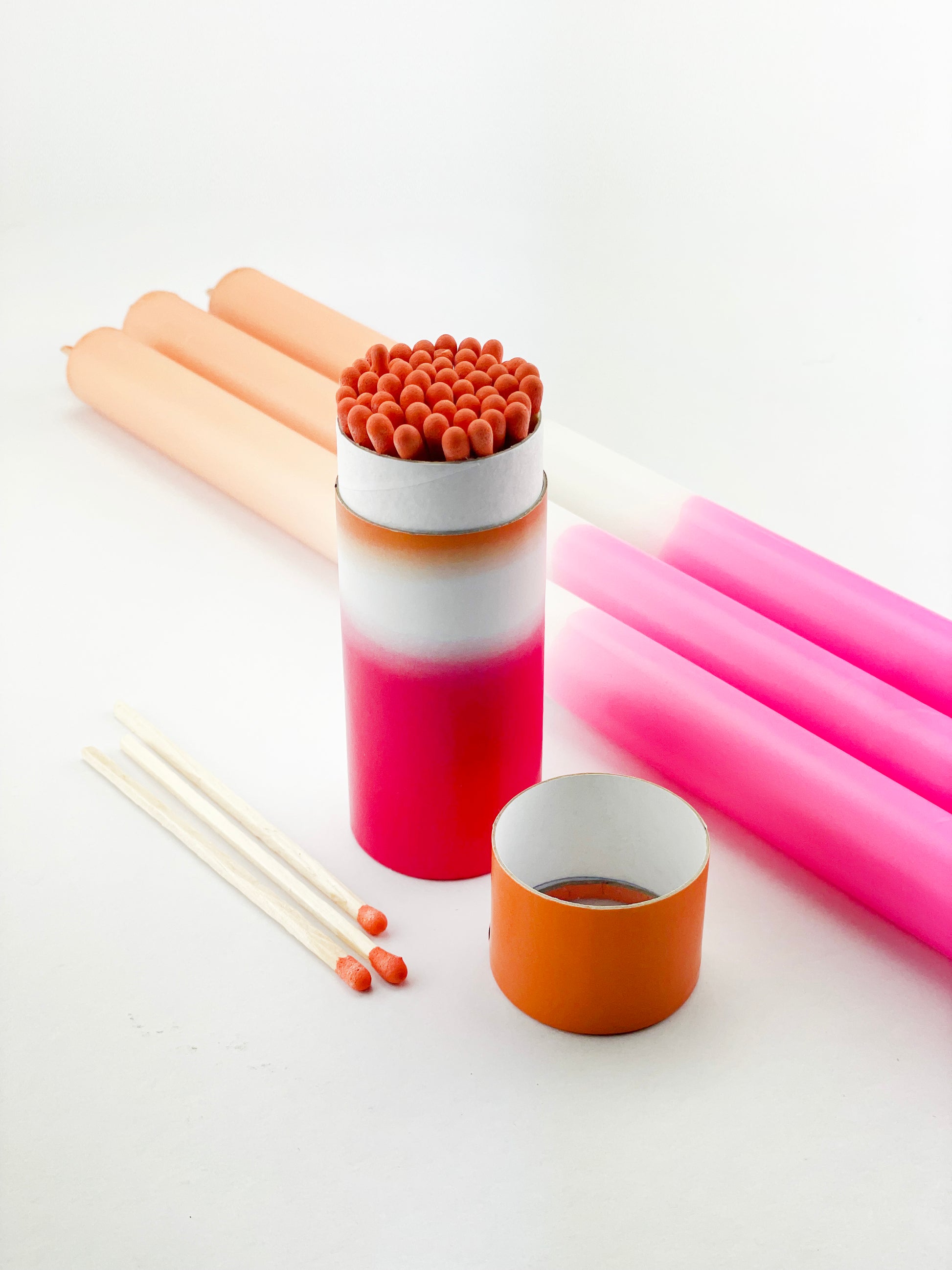 These new ‘colour coordinated’, cylindrical match boxes contain aproximately 55 extra long and robust matches.