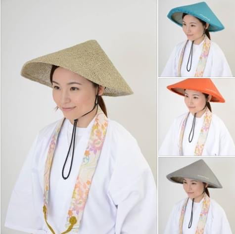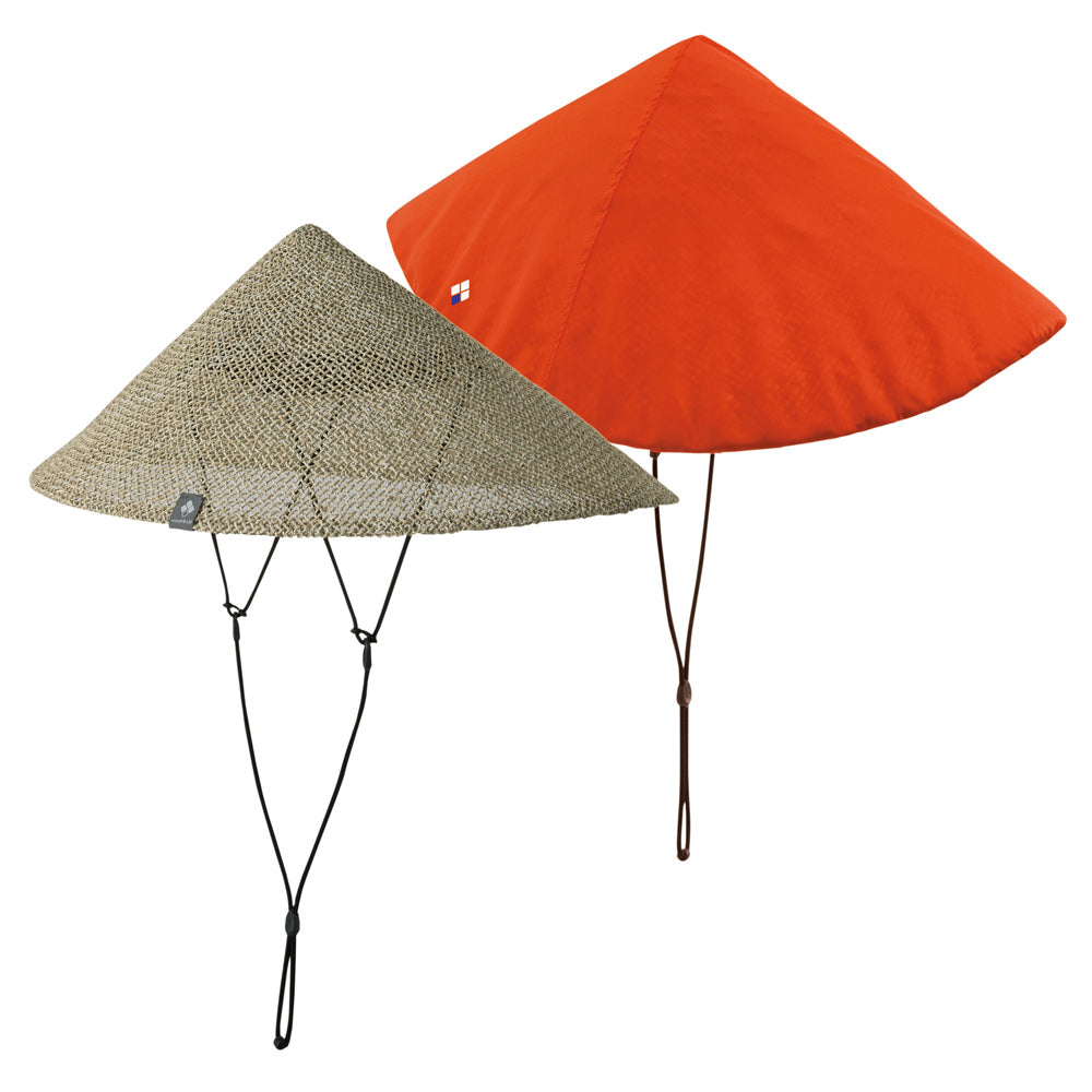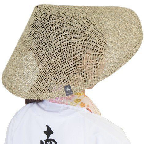 This Japanese traditionally-shaped triangular hat feels cool and is made from natural straw. Space at the back of the head vents heat and moisture, ensuring a cool fit even in midsummer. The natural straw has a supporting thread woven into it, ensuring that the hat keeps its shape. Includes a protective rain cover that can be stored inside the product. Comes with loops used to attach a hat screen (sold separately).