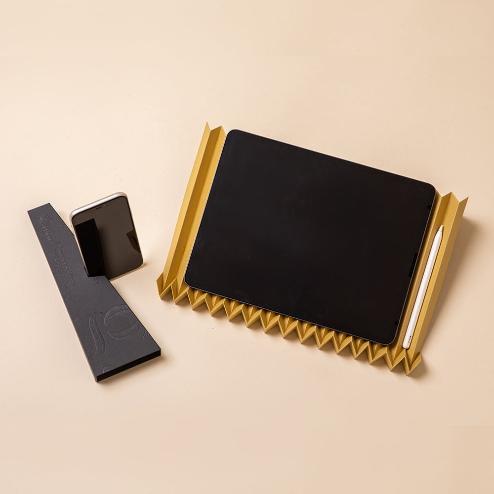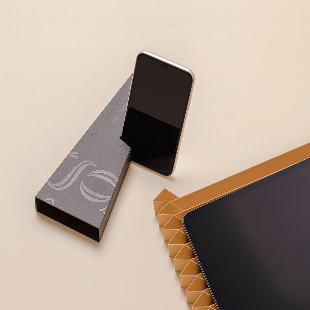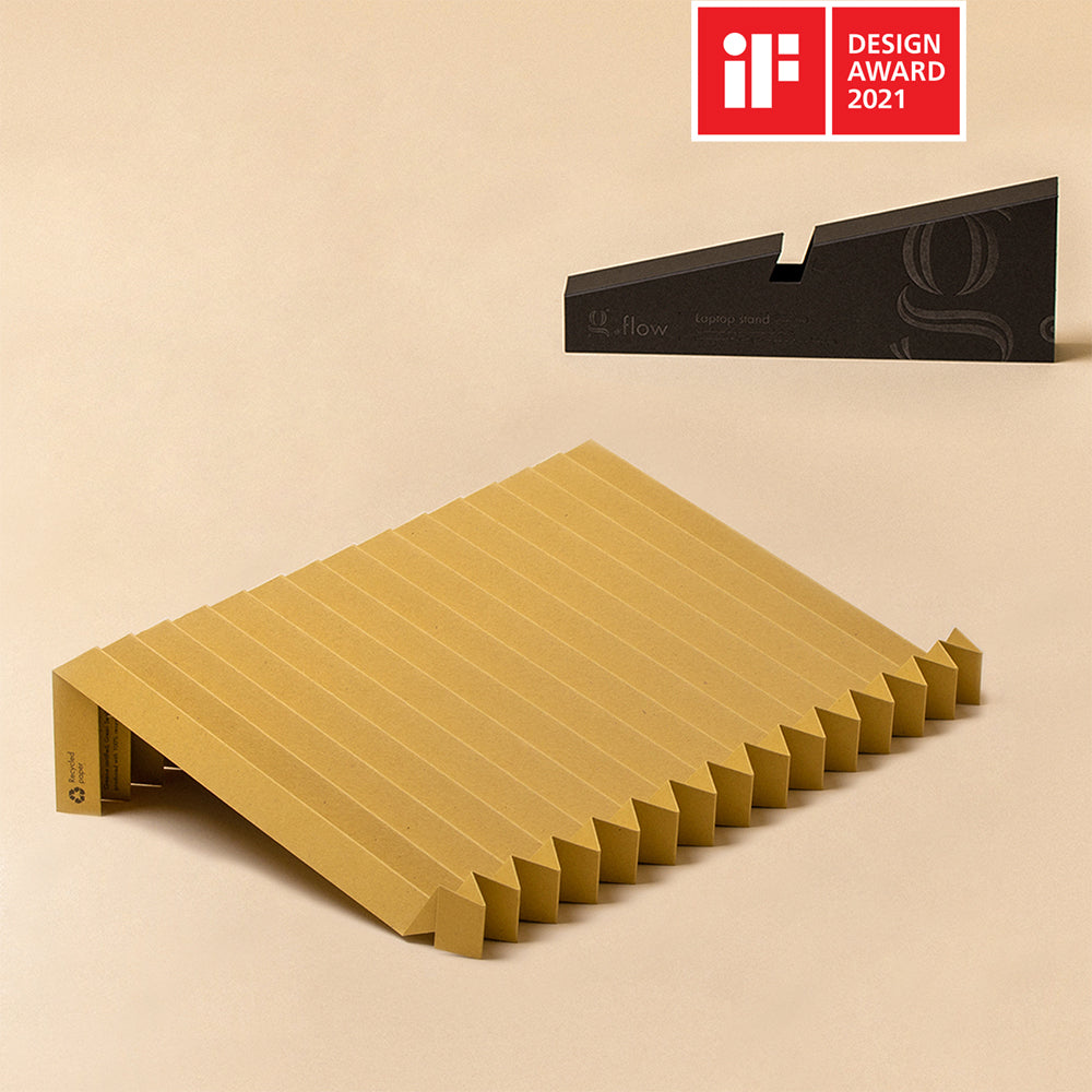 The product is completely free from chemical processes such as adhesives and coatings and is designed to return to nature at the end of its life. Origamic structure allows a single sheet of recycled paper to become a product without any chemical processing. This attractive folding technology allows you to withstand 5kg of heavy laptops, and helps to keep the air flowing preventing the devices from overheating.