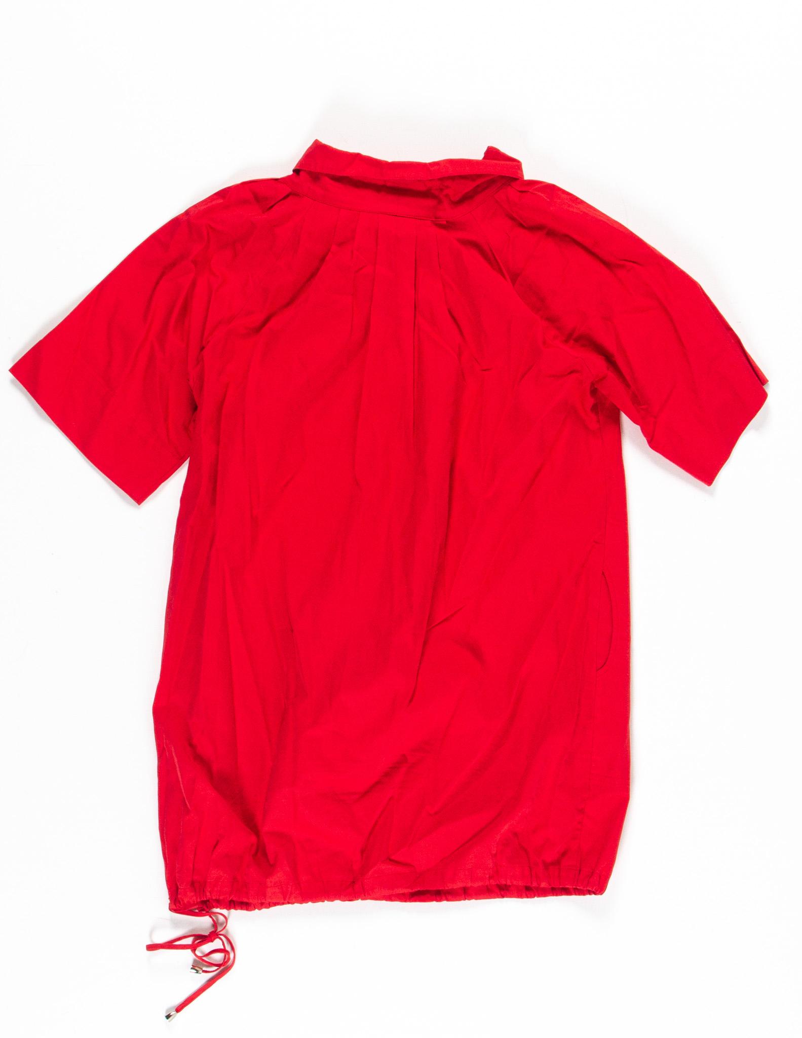 This sporty red cotton dress has strings both at neck and on the hem for tightening. Small pockets on the sides.